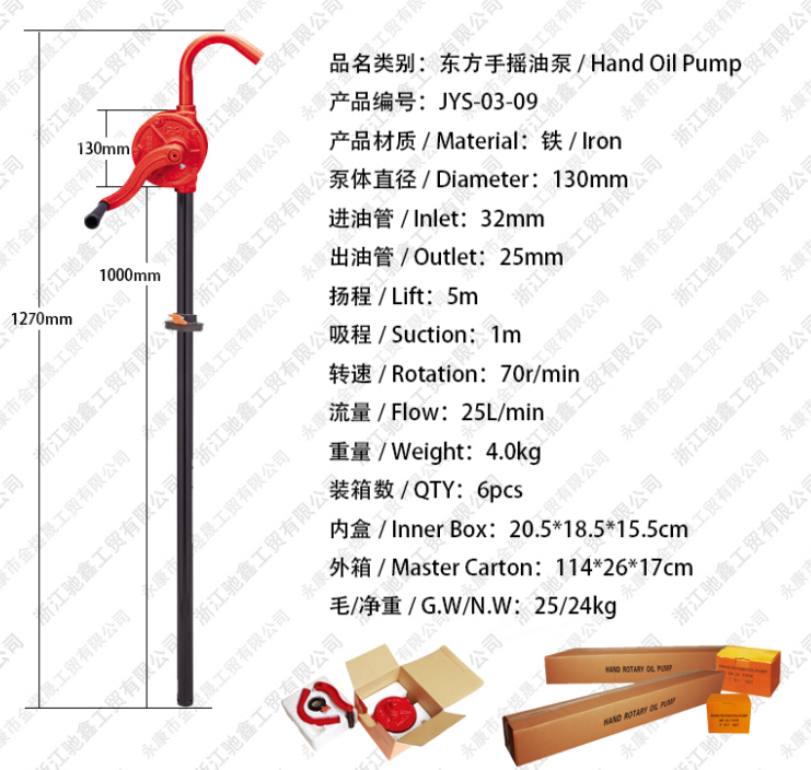 | Clasificación del nombre del producto: bomba de aceite manual Touhou | Edición del producto: ME-03-09 | Material del producto: Hierro | Diámetro del cuerpo de la bomba / Diámetro: 130 mm | Tubo de aceite / Entrada: 32 mm | Tubo de aceite / Salida: 25 mm | Ascensor: 5m | Succión: 1m | Rotación: 70r/min | Caudal / Caudal: 25L / min | Peso: 4kg | Número de cajas / CANT: 6 piezas | Caja interior: 20,5*18,5*15,5 cm | Caja exterior / Caja principal: 114 * 26 * 17 cm | Cabello / peso / GW / NW: 25 / 24kg |