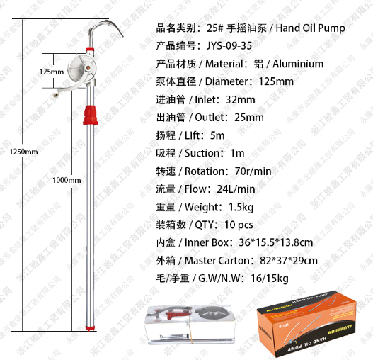 | Clasificación del nombre del producto: 25 # bomba de aceite manual | Edición del producto: ME-09-35 | Material del producto: Aluminio / Aluminio | Diámetro del cuerpo de la bomba / Diámetro: 125 mm | Tubo de aceite / Entrada: 32 mm | Tubo de aceite / Salida: 25 mm | Ascensor: 5m | Succión: 1m | Rotación: 70r/min | Caudal / Caudal: 24L / min | Peso: 1,5 kg | Número de cajas/cantidad: 10 piezas | Caja interior: 36*15,5*13,8 cm | Caja exterior / Caja principal: 82 * 37 * 29 cm | Cabello / peso / GW / NW: 16 / 15kg |